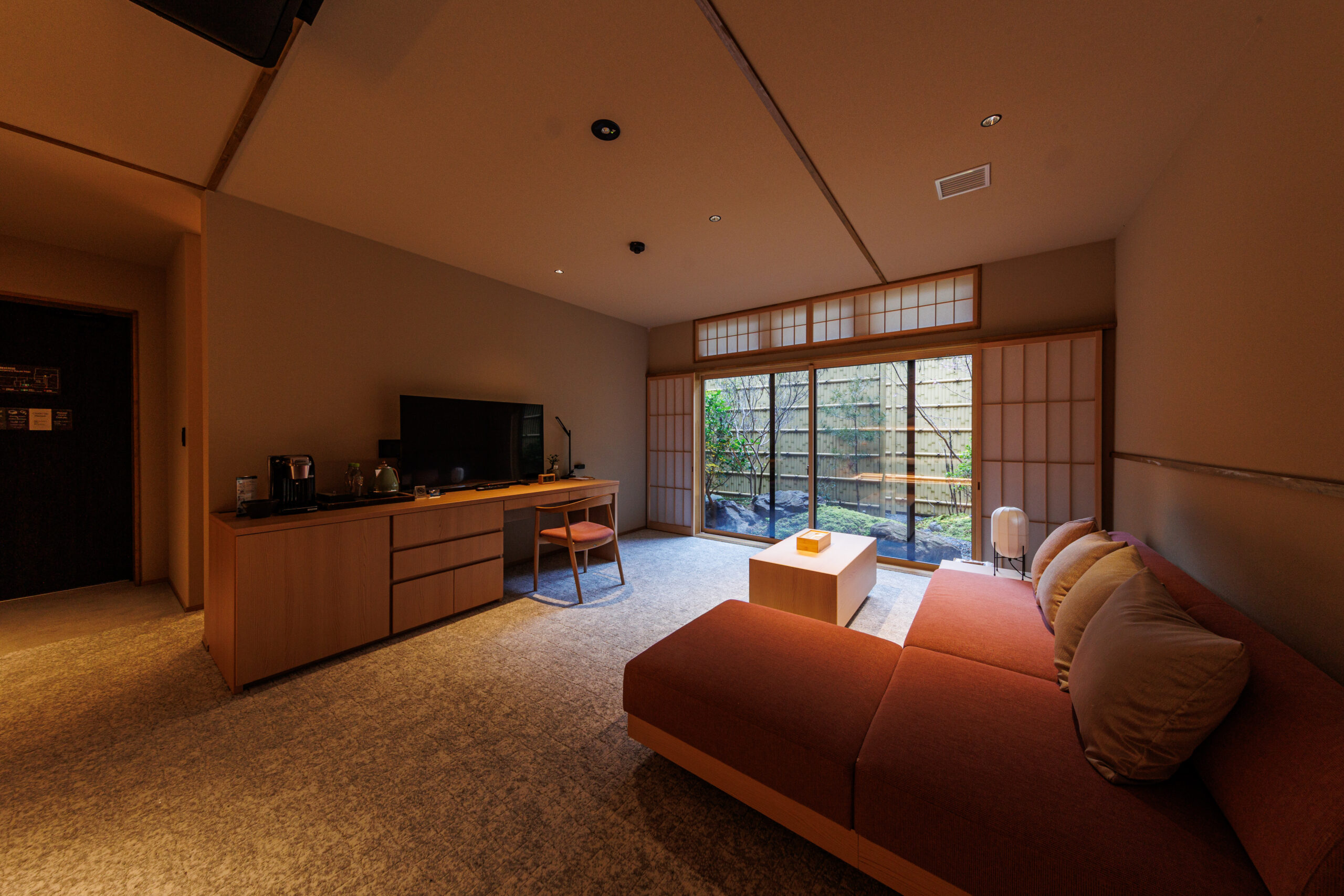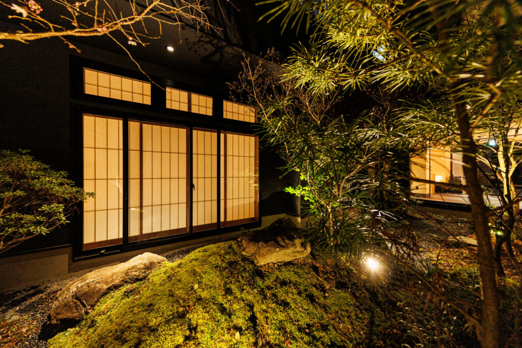 窓の向こうには、四季の移ろいを映す日本の中庭。朝の静けさ、夕暮れのやわらかな陰影など、時間帯ごとに異なる表情を楽しむことができます。